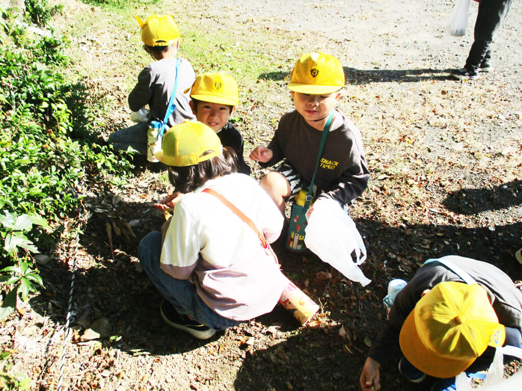 「大きなどんぐりがあった!」 「いがの中に栗が入っているよ!」 「きれいな葉っぱ見つけた!」と大はしゃぎ。 秋見つけだけでなく、工夫していがの中の栗を取り出したり、木の棒で幹をたたいて音を楽しんだり、木々の間を駆け回ったり・・・子どもたちは遊びを見つける天才ですね。