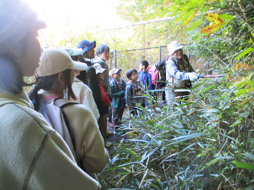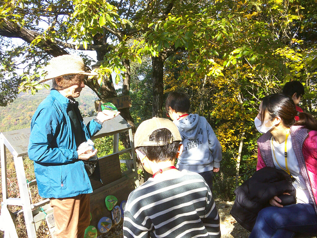 山頂では展望だけでなく、鳥本さんからいただいた小鳥のえさを餌台に置いたり、ヤマガラの餌付けの話を聞いたりしました。