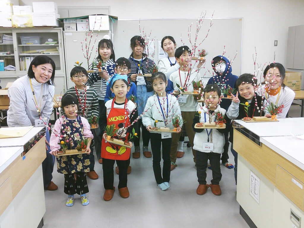 木工作や山王山登山でお世話いただいた高橋正次さんと講師の松田邦子さんに、木材の端材やスモモ、金柑、松の樹木の剪定した枝や葉を利用して、木の台や飾りの材料を事前に準備していただきました。