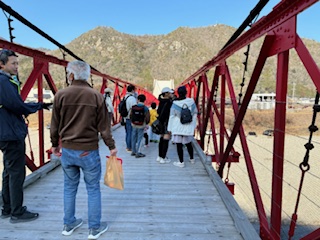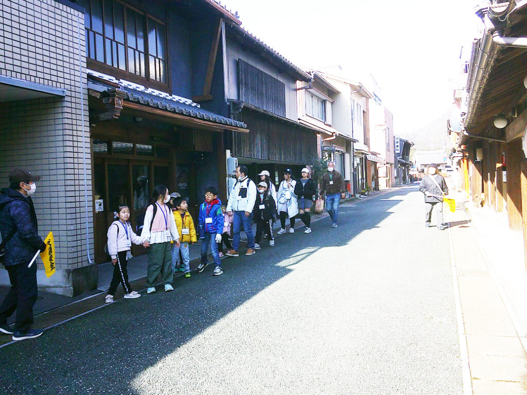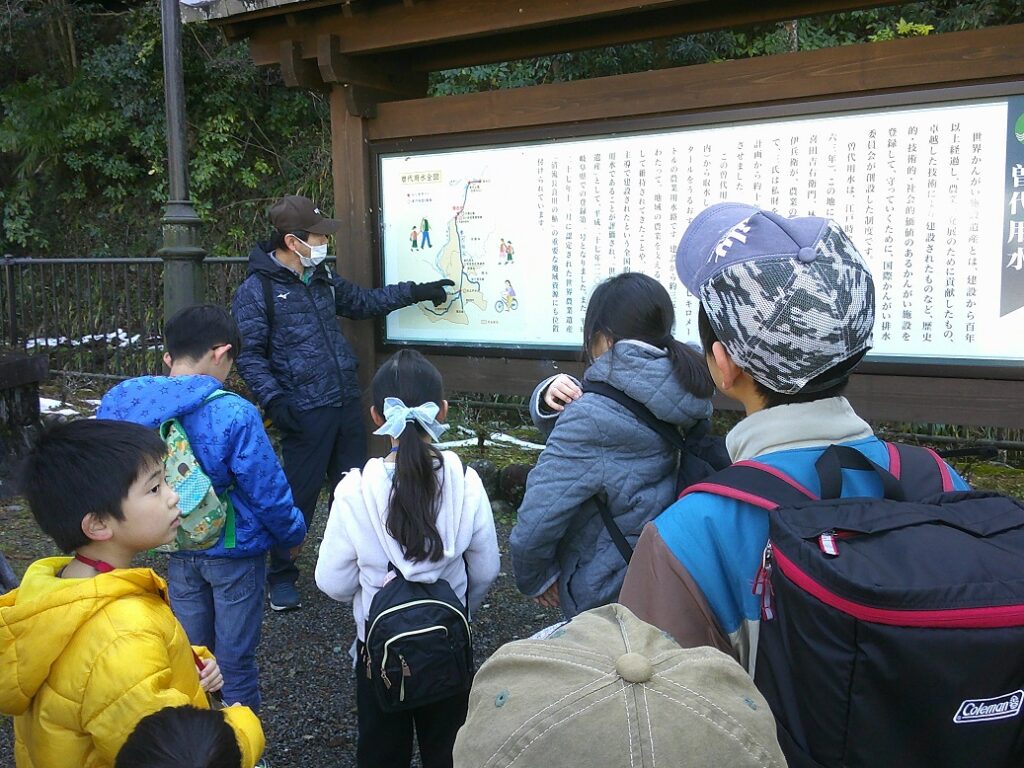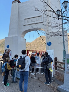 西側に下り、「行ってみたい」の一声で美濃橋を往復し、川湊灯台等のいろいろな解説掲示を6年生に読んでもらいました。