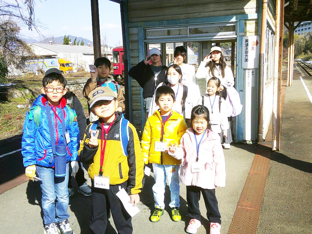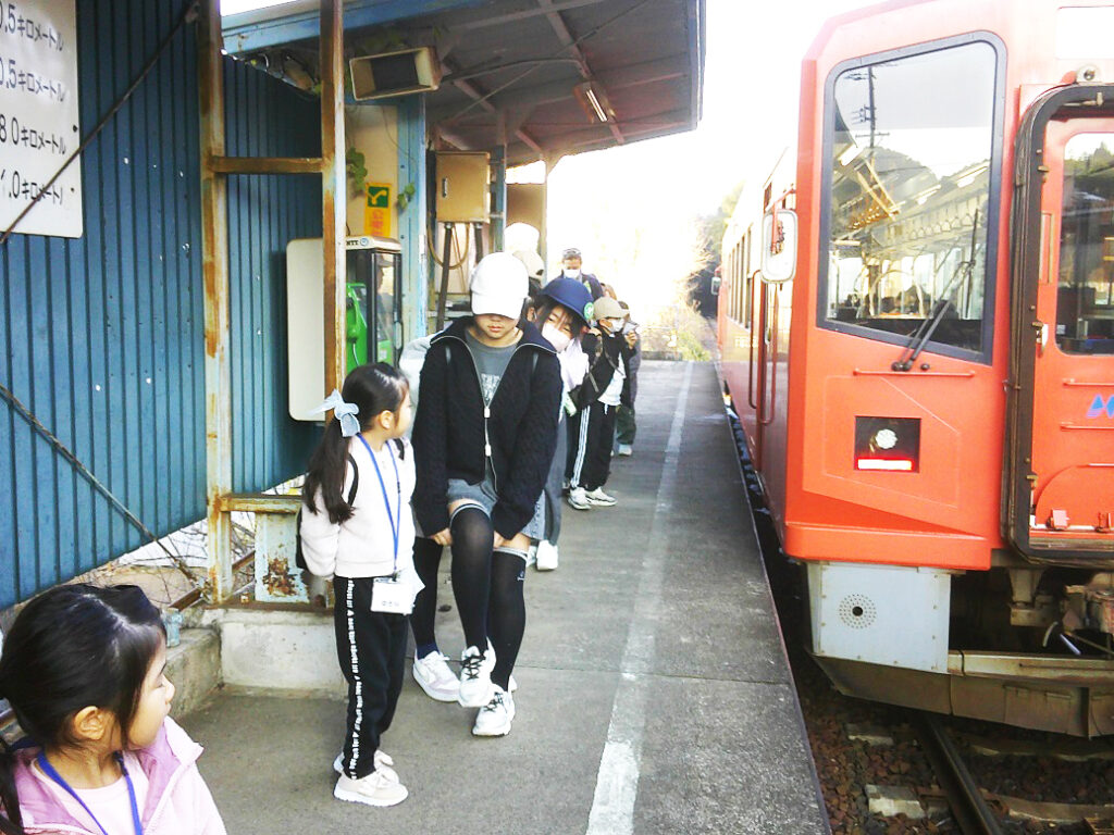 街中を歩き、美濃町線を走っていた電車に乗り、美濃市駅で一人一人が乗車券を購入しました。