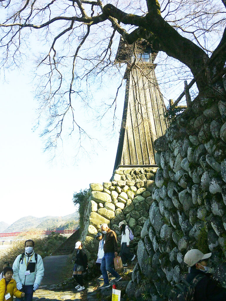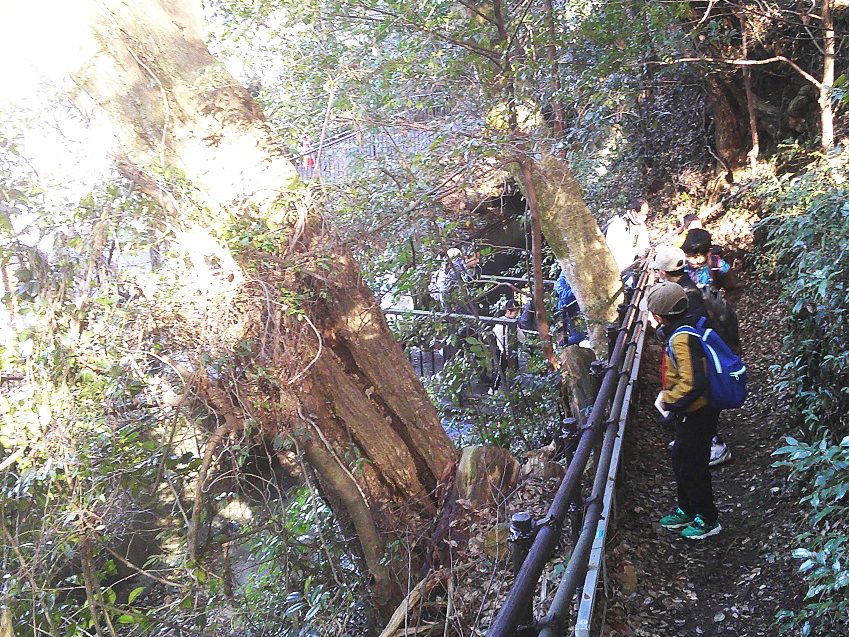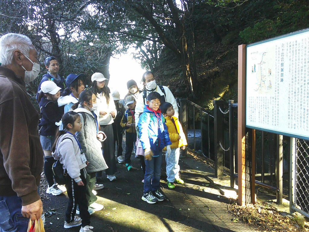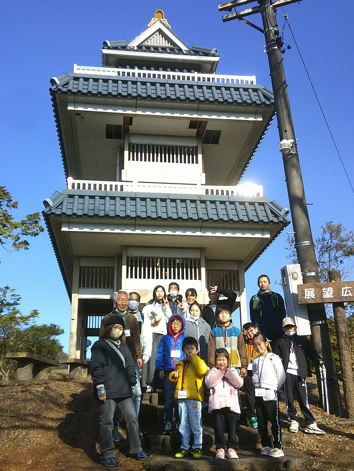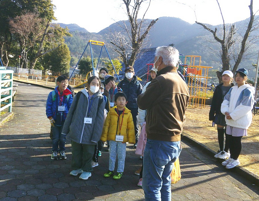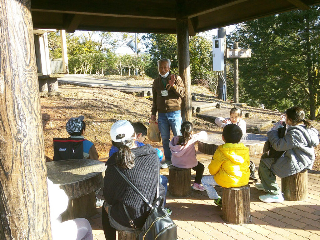 動物舎前から木々の間を通って「かたらい広場」まで来ると、「ロケットのようなものは何?」という声が上がり、砲弾を模した日露戦争忠魂碑を見てから展望台に登り、曽代地区を流れる用水や長良川の橋などを見つけたり双眼鏡で確かめたりしました。公園で講師の高井敏さんから昔の小倉公園の様子や展望台(サイレン塔)の役割を教えてもらいました。