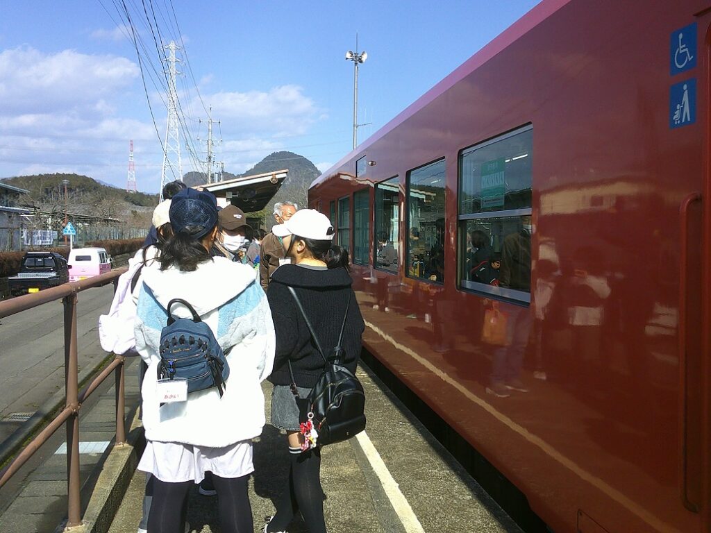 滞りなく乗車し、関下有知駅ホームに着き、人が多いのに驚いていましたら、お出迎えの人たちで二度びっくりしました。 好天に恵まれた催しになりました。